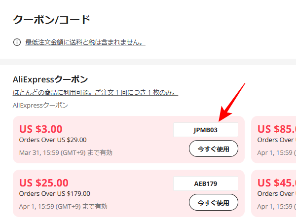 3月末のAliExperss Pay Dayが始まっています。アプリからタップで取得できないAliExpressコードです。カートで適当な商品を選んで購入画面に進み一度適用すると自動的にクーポンとしてストックされるタイプです。