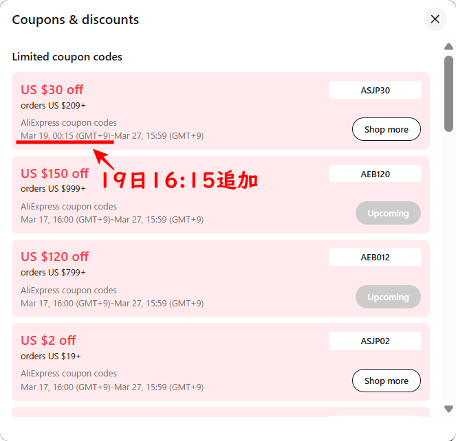 AliExpress Anniversary Saleの残り時間もあと僅かです。結局今回は30種類以上のAliExpressクーポンが五月雨で発行された模様。単なるコード文字列違いではなく価格も異なるクーポンが多数追加されました。事前に発行されなかったのはクーポンとの合せ技で値引き額を決めるストア対策でしょうか。