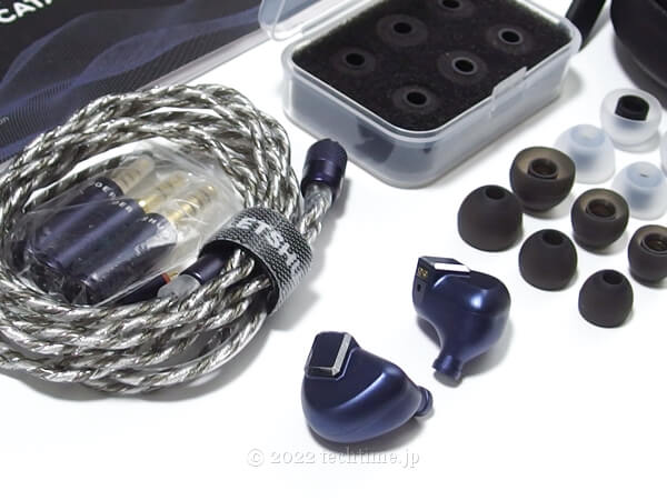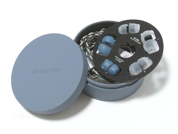 脱着プラグ式の付属ケーブル、シリコンイヤーピース2種類各3サイズ、スクリュー蓋の丸いハードケースが付属します。