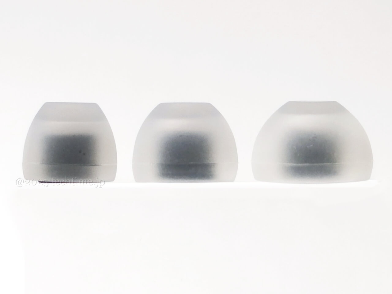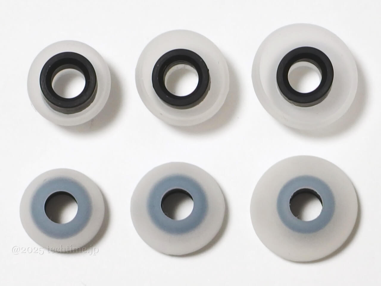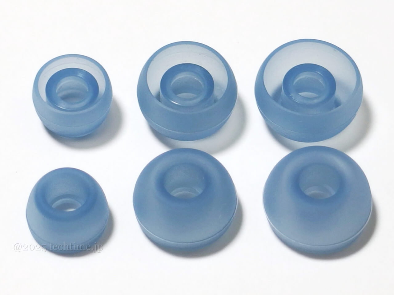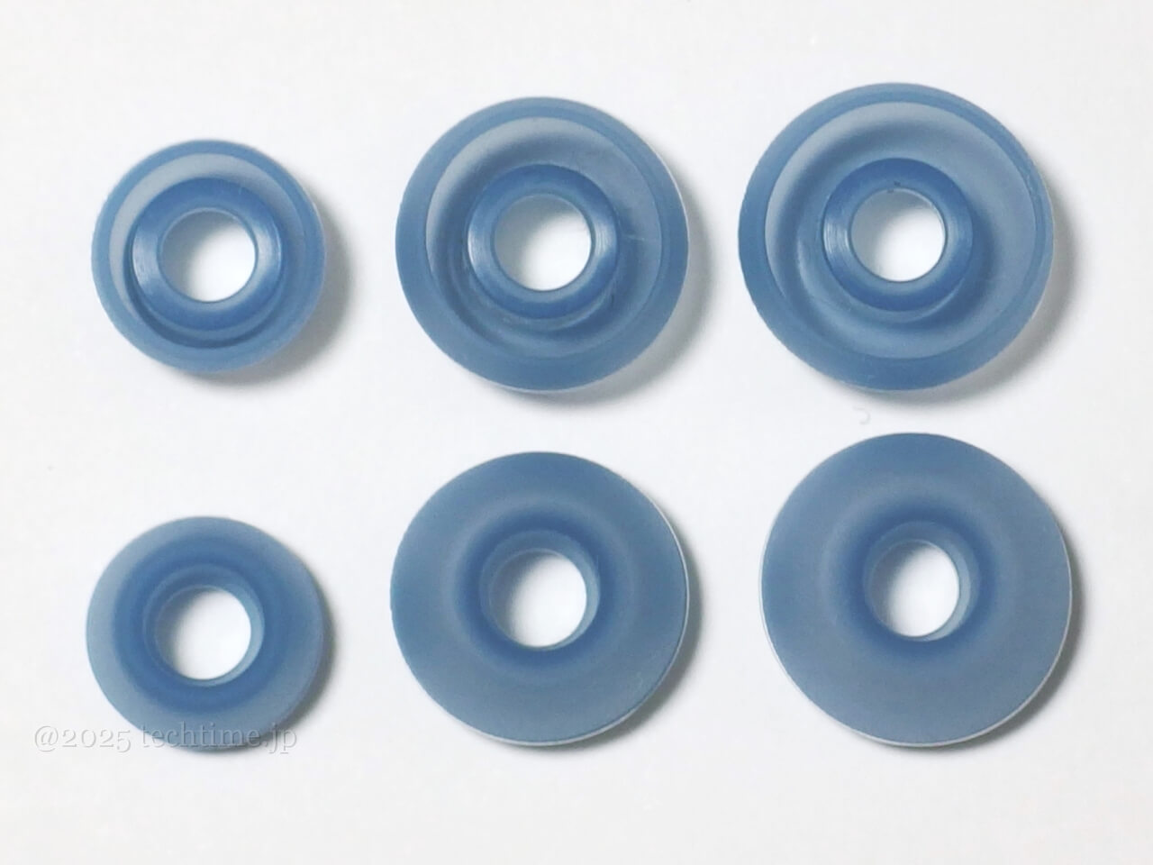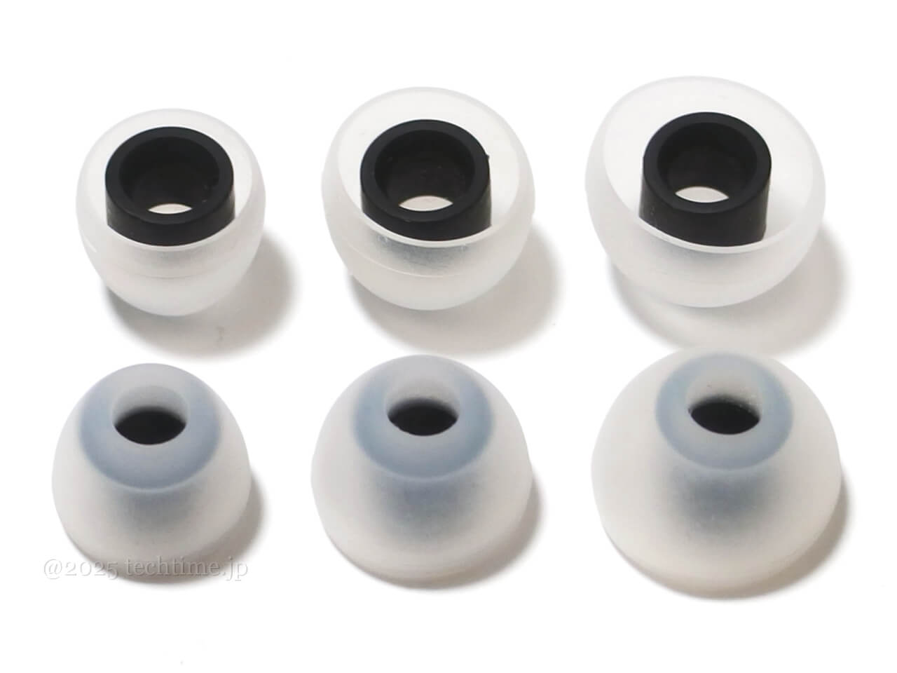 2種類のシリコンイヤーピースが3サイズ各1ペア付属します。